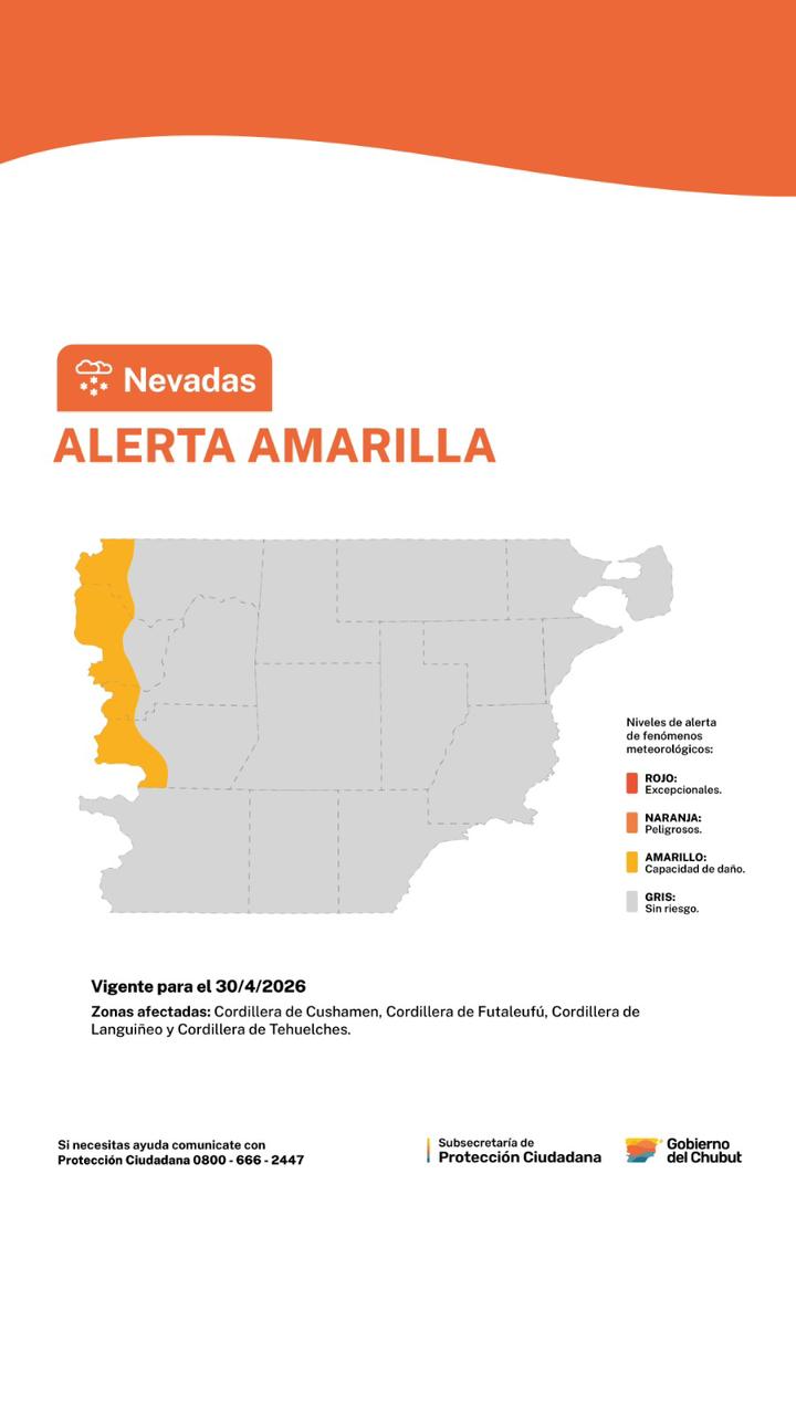 El Servicio Meteorológico Nacional informó la vigencia de una alerta amarilla por nevadas que afectará a la región cordillerana durante la noche del jueves 30 de abril.