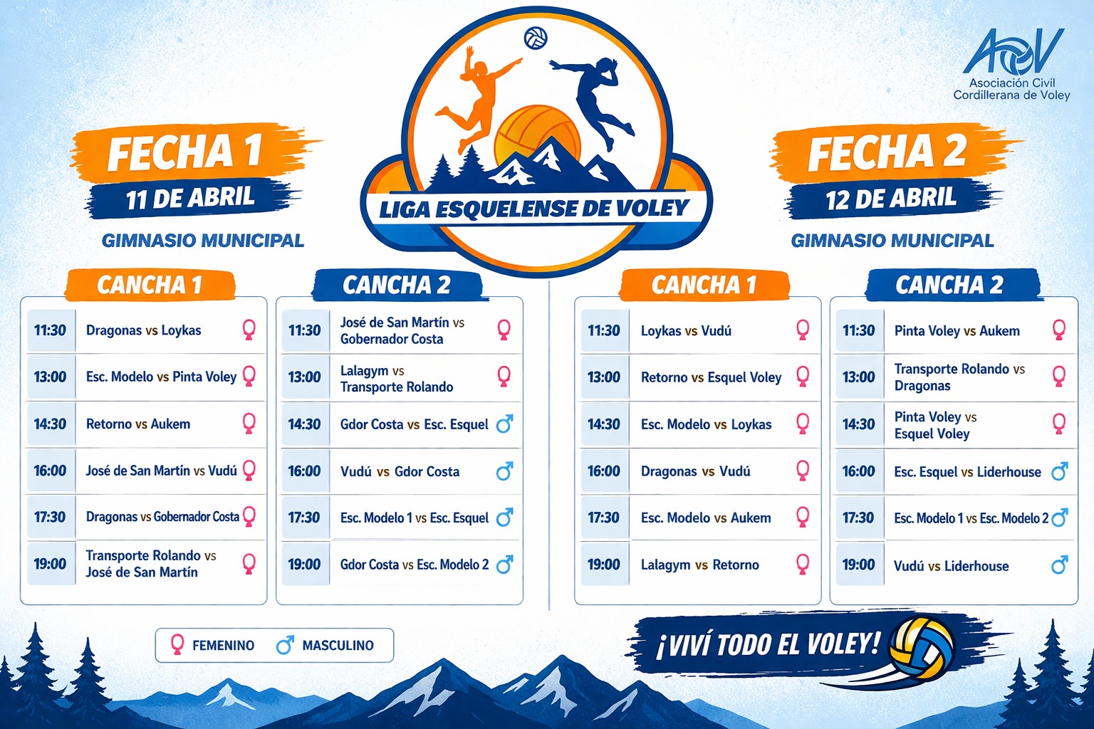 - 13:00 — Retorno vs Esquel Voley (Femenino)