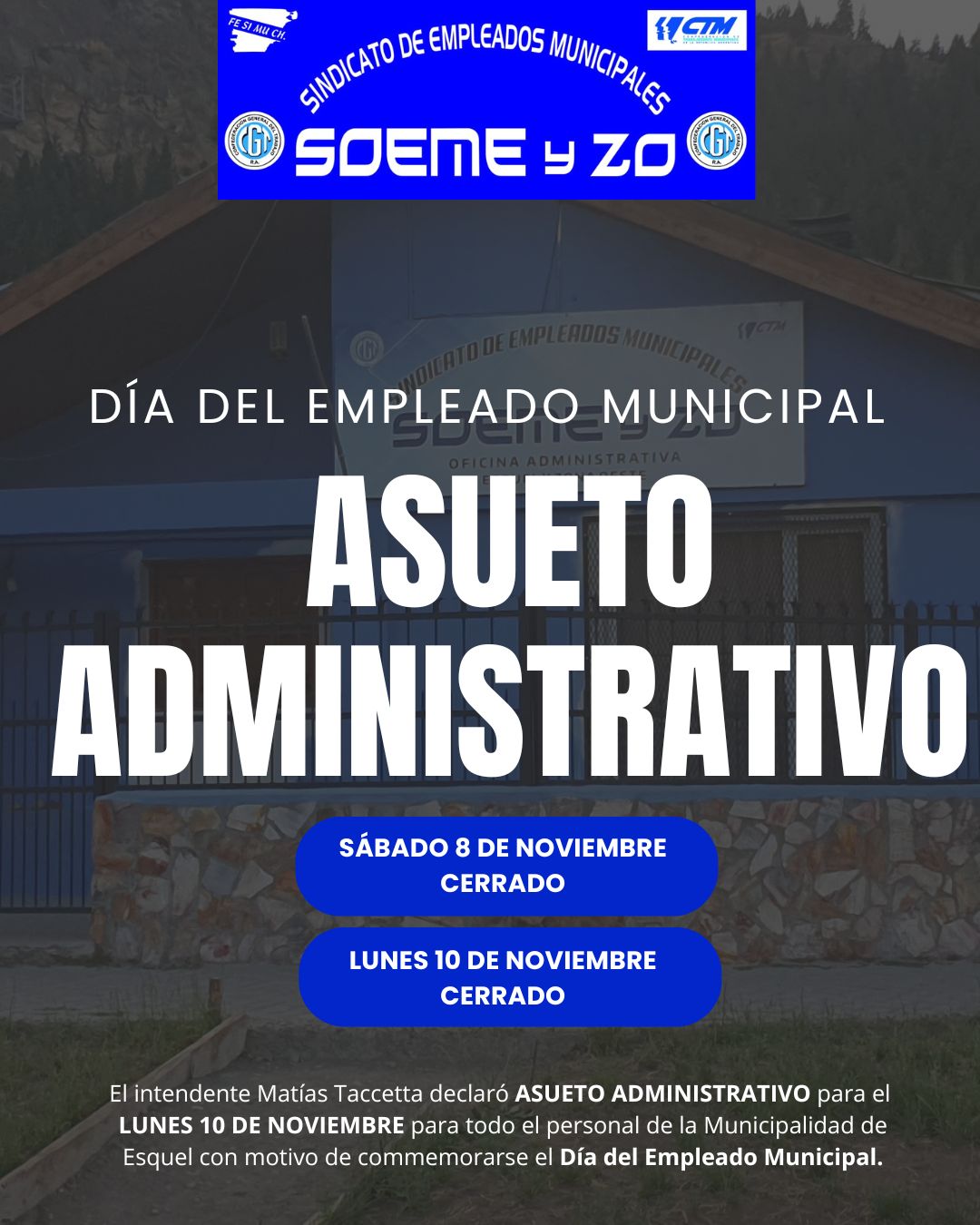El Sindicato de Obreros y Empleados Municipales de Esquel y Zona Oeste comunicó que, en el marco de la conmemoración del Día del Empleado Municipal, no habrá atención administrativa en su oficina el sábado 8 de noviembre.