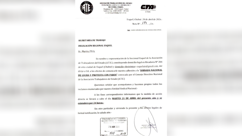 La notificación fue presentada ante la Delegación Regional Esquel de la Secretaría de Trabajo, donde la conducción local informó que la medida de fuerza se llevará adelante este martes 21 de abril y tendrá una duración de 24 horas.
