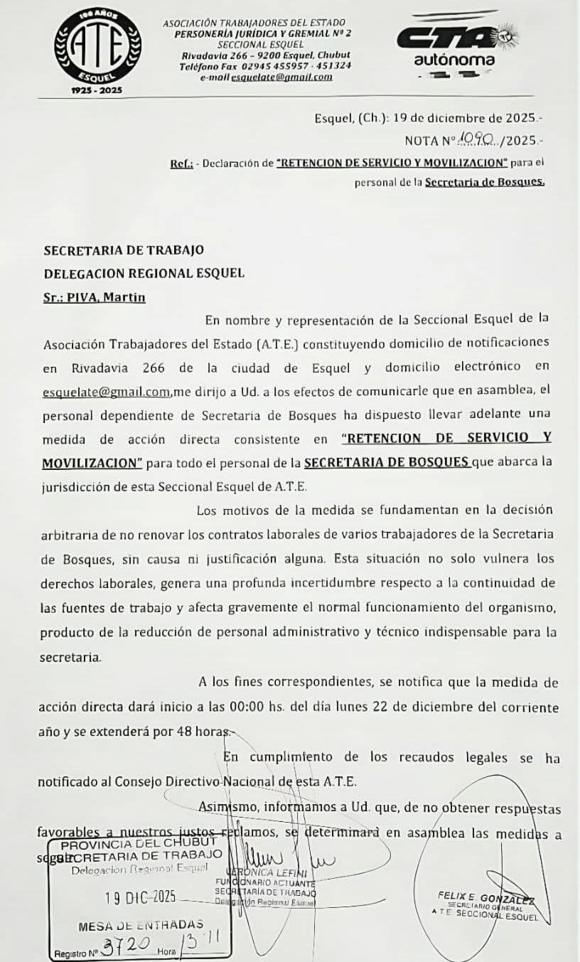 La Seccional Esquel de la Asociación Trabajadores del Estado (ATE) informó que el personal dependiente de la Secretaría de Bosques resolvió en asamblea realizar una medida de acción directa consistente en retención de servicios y movilización.