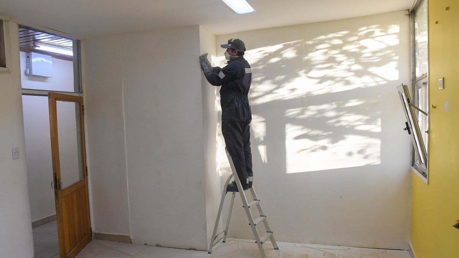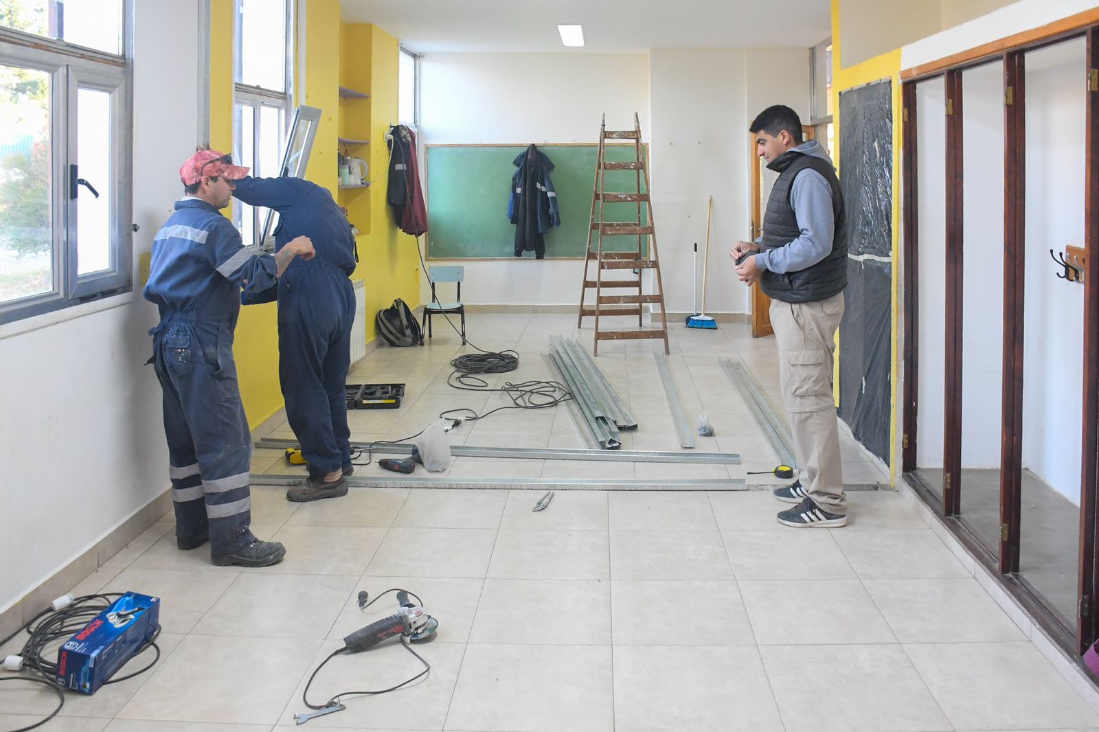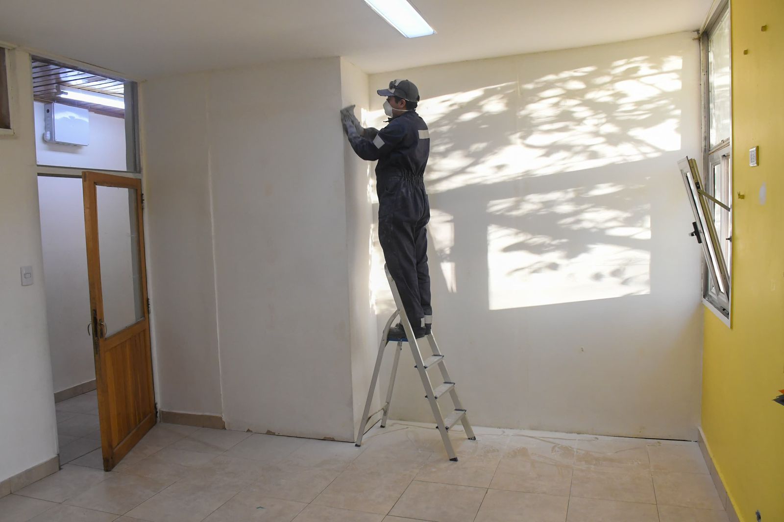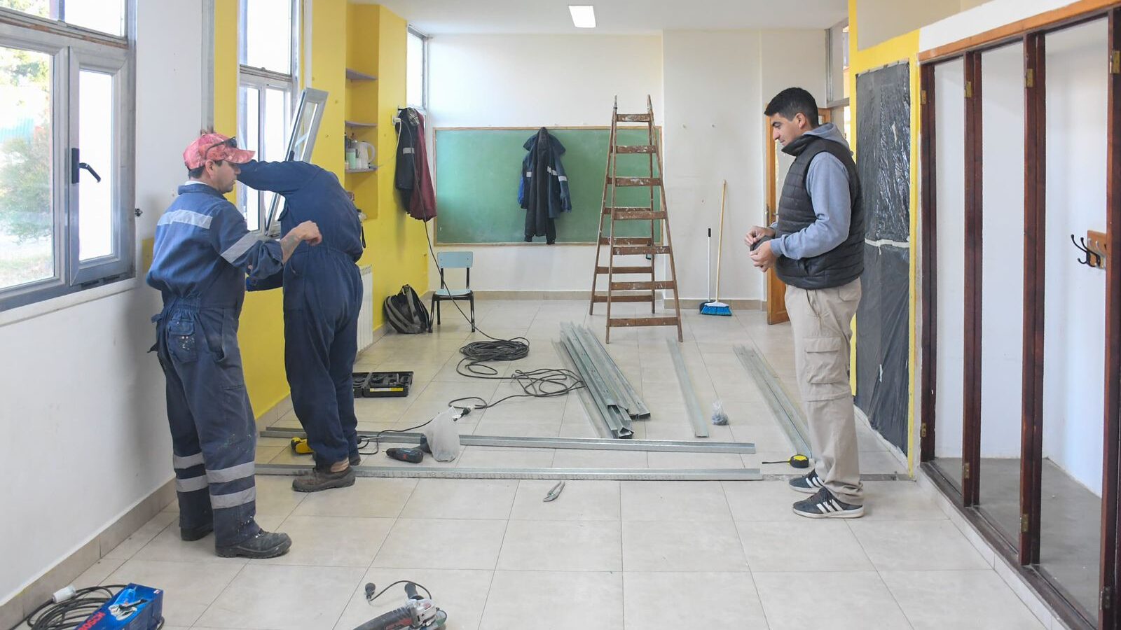 Las tareas realizadas incluyeron la finalización de un tabique de placas de yeso, que demandó trabajos de masillado, lijado y pintura para su correcta terminación. Además, en otro sector del edificio se concretó la división de un salón mediante la construcción de un nuevo tabique, que también recibió terminaciones completas.