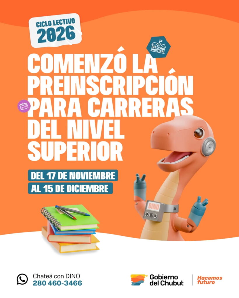 El registro para aspirantes se realizará exclusivamente a través de DINO, el asistente virtual del Gobierno del Chubut. Para iniciar el trámite, se debe enviar un mensaje al 280 460-3466, ingresar a Gestiones desde el menú y seleccionar “Preinscripción ISFD”.