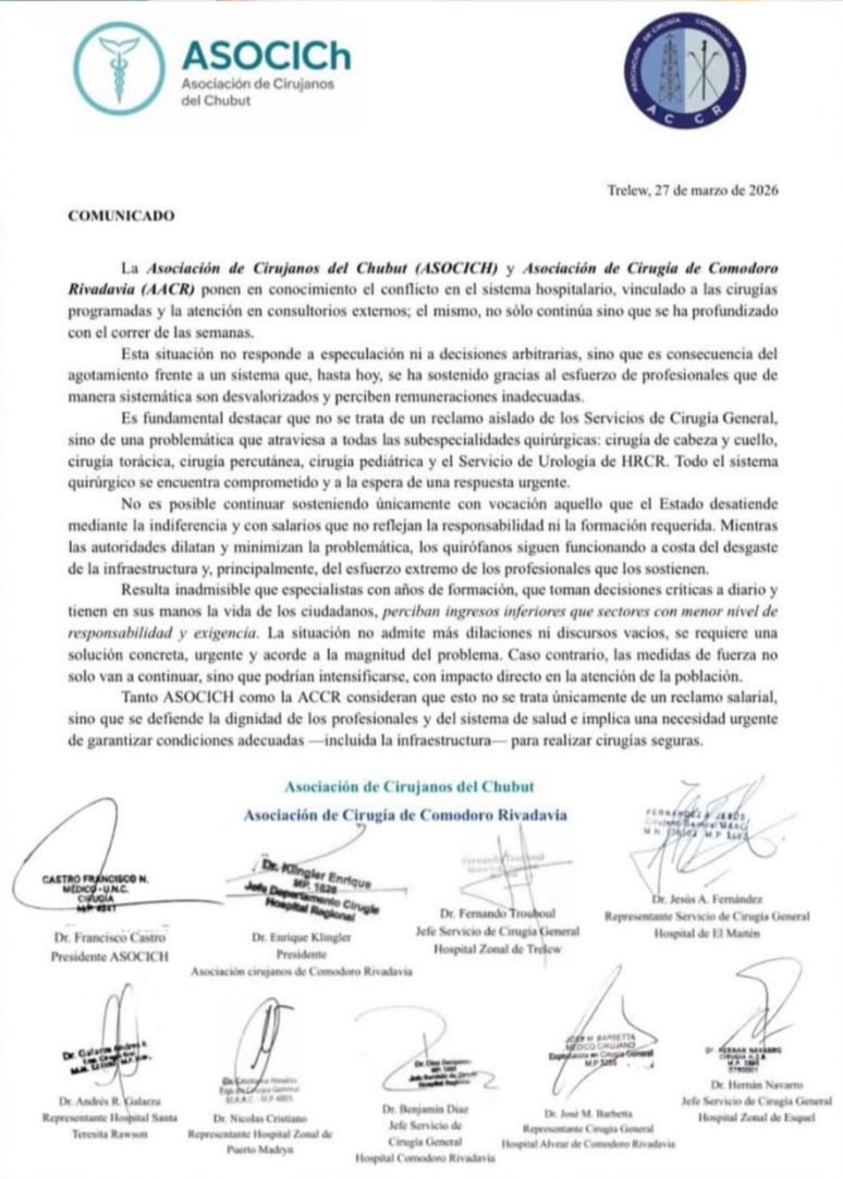 La Asociación de Cirujanos del Chubut (ASOCICH) y la Asociación de Cirugía de Comodoro Rivadavia emitieron un nuevo comunicado en el que advierten que el conflicto en el sistema hospitalario provincial no solo continúa, sino que se ha profundizado.