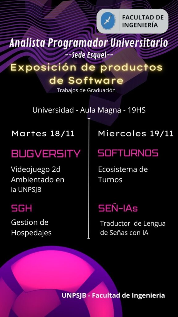 La actividad se desarrollará los días 18 y 19 de noviembre, a partir de las 19 horas, en el Aula Magna del Edificio de Aulas. La muestra constituye un espacio de celebración académica en el que los flamantes egresados tendrán la oportunidad de presentar públicamente sus desarrollos tecnológicos.