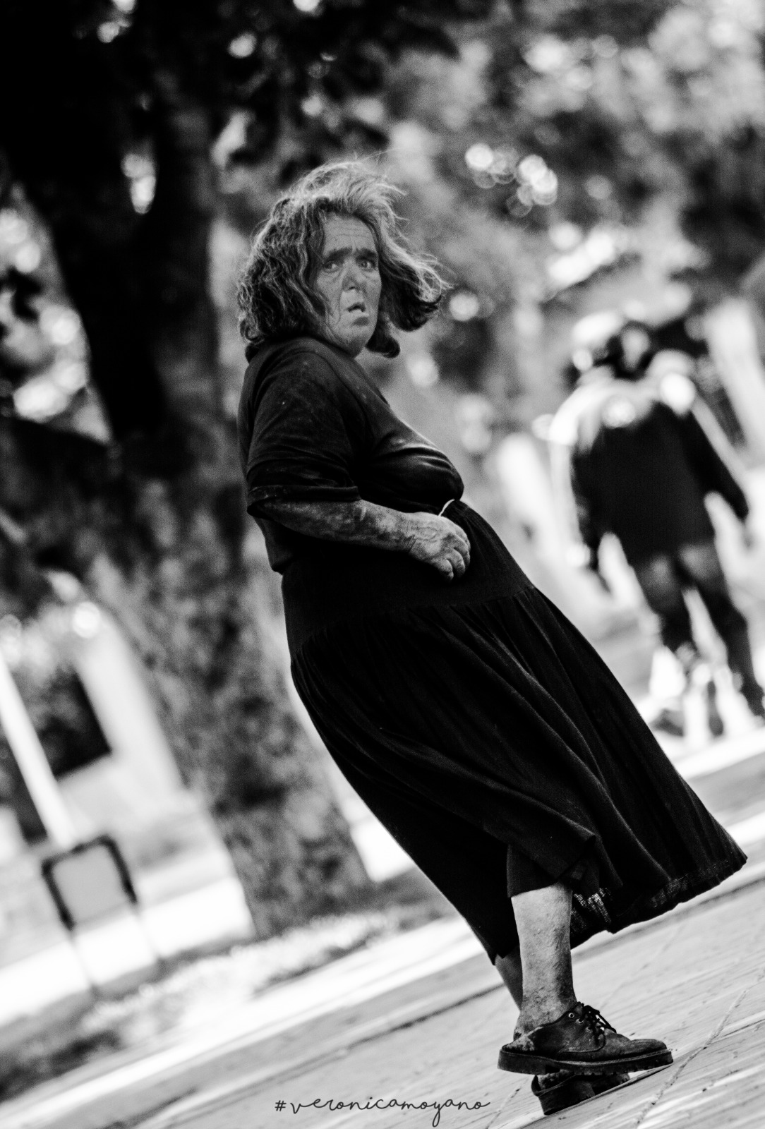 Zenobia caminó durante años las calles de Esquel sin esperar notoriedad. Pollera larga, remera negra, un “puchito” en la mano y andar solitario: su imagen se volvió reconocible para generaciones de vecinos. Sin proponérselo, también se convirtió en fuente de inspiración artística.