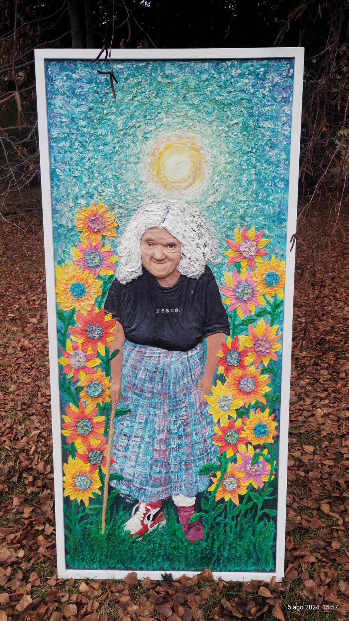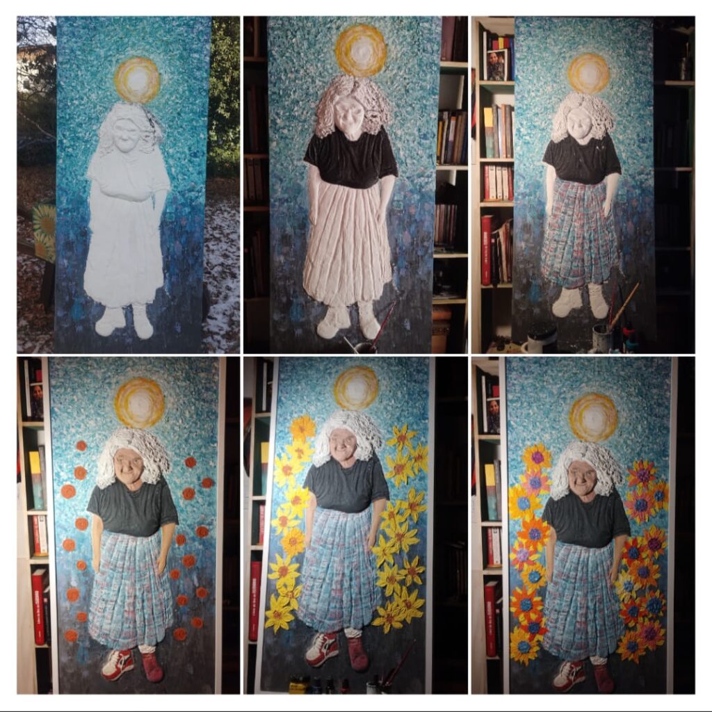 La obra, realizada en madera sobre MDF, con relieve en enduido y acrílicos, dialoga estéticamente con el universo floral de Vincent van Gogh. “Quería sacarla de la mirada fija de verla siempre en la calle y mostrar lo que había en su mirada”, resumió Ezcurra.