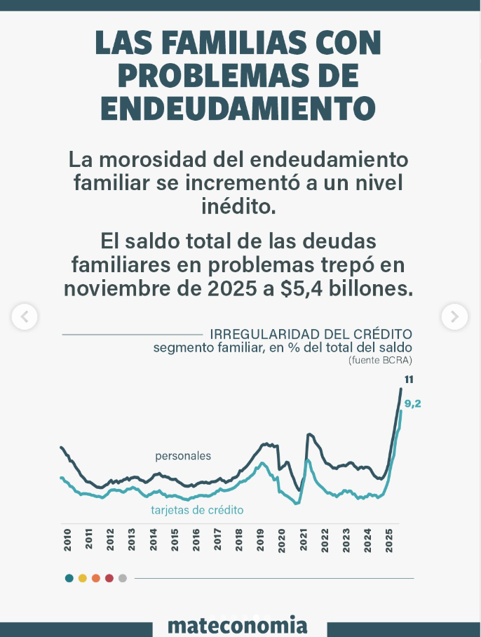Según informes del sistema financiero, la morosidad de las familias alcanzó en diciembre de 2025 el 9,3%, el nivel más alto en veinte años, con 14 meses consecutivos de aumento.