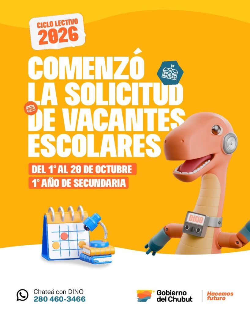 El Ministerio de Educación del Chubut convoca a las familias a realizar la solicitud digital de vacantes para estudiantes ingresantes a 1° año del Secundario (Ciclo Lectivo 2026) entre el 1° y el 20 de octubre, mediante la plataforma DINO.
