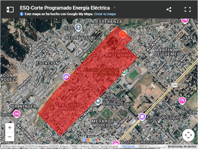 La Cooperativa 16 de Octubre Ltda. comunicó que este jueves 27 se realizarán dos cortes programados en el suministro de energía eléctrica, tanto en la ciudad de Esquel como en la zona rural de la Ruta 259.