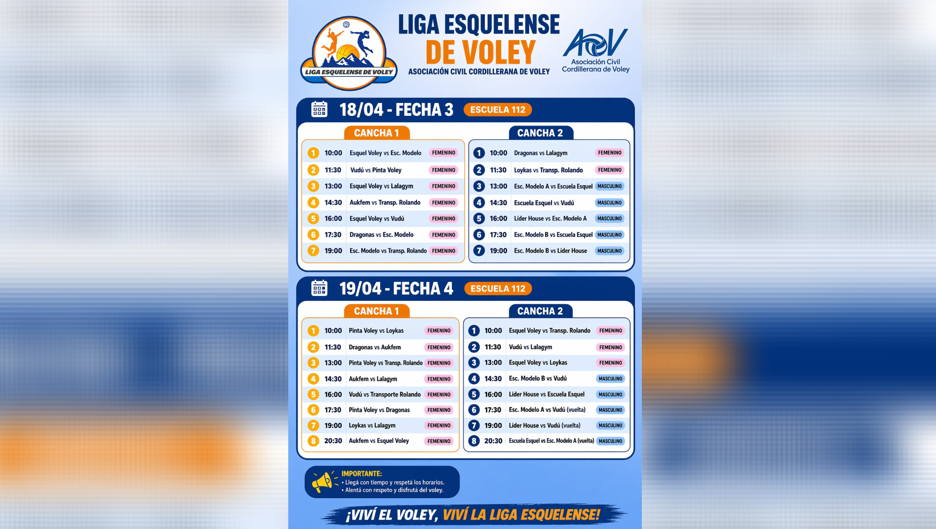 El vóley vuelve a ser protagonista en Esquel con un fin de semana cargado de actividad en el marco de la Liga Esquelense de Vóley (LEV), que continúa desarrollando su calendario oficial 2026.