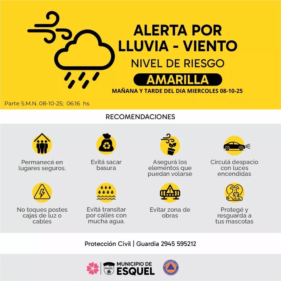 - Miércoles 8 de octubre (Esquel y alrededores): rige alerta amarilla por LLUVIA y VIENTO.