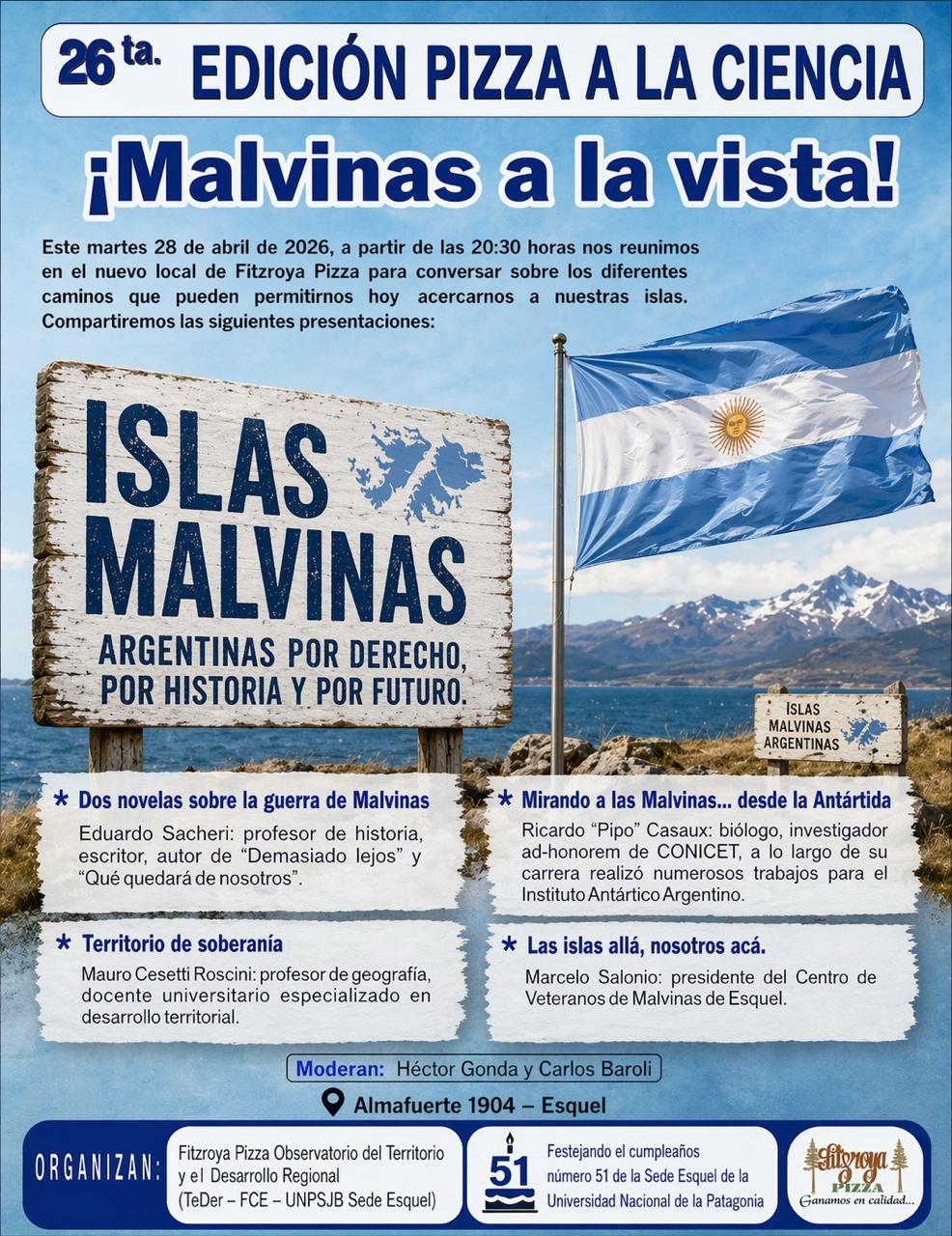 Este martes 28 de abril, desde las 20:30 horas, se realizará en Esquel la 26° edición de “Pizza a la Ciencia”, un espacio que combina divulgación, intercambio y encuentro en un formato descontracturado. La cita será en la pizzería de calle Almafuerte 1904, con un eje temático que atraviesa historia, geopolítica y soberanía: “Malvinas a la vista”.