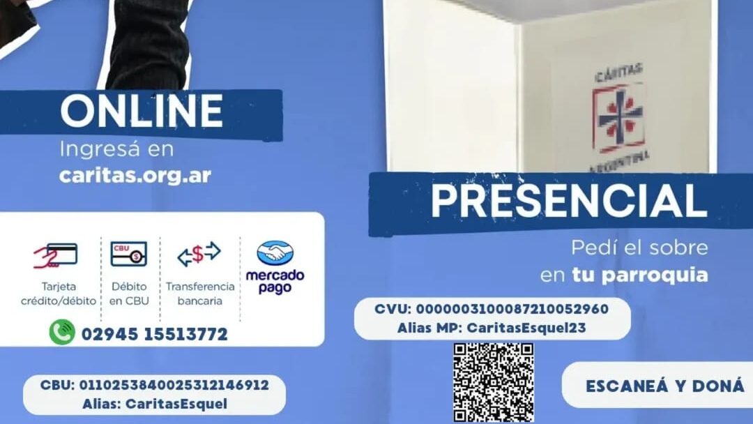 * Medios digitales: a través de QR, Link, Mercado Pago o transferencias bancarias. Las cuentas oficiales están disponibles en las redes sociales de Cáritas.