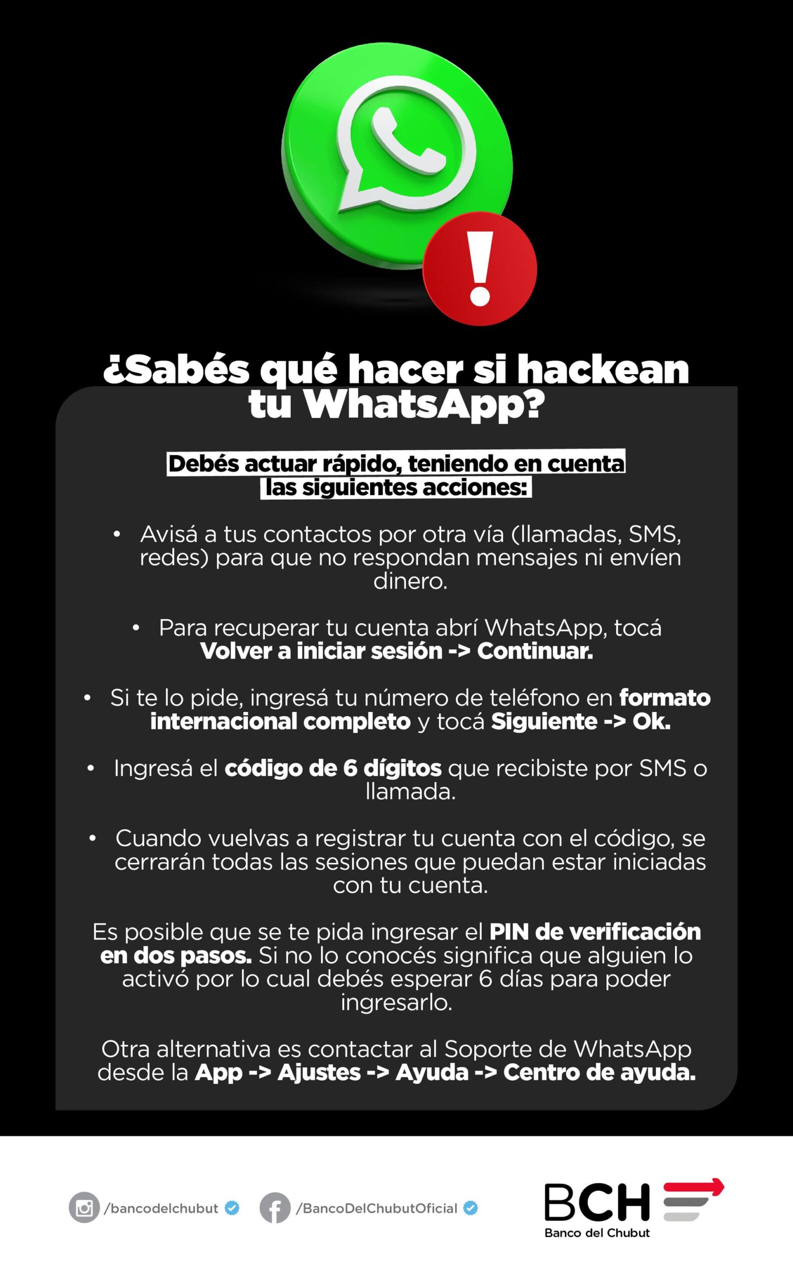 Los casos de hackeo de cuentas de WhatsApp continúan en aumento en Chubut y en todo el país, y suelen estar vinculados a estafas económicas, pedidos de dinero falsos y suplantación de identidad. Frente a esta situación, el Banco del Chubut recordó una serie de pasos fundamentales que deben seguirse apenas se detecta el acceso indebido a la cuenta.