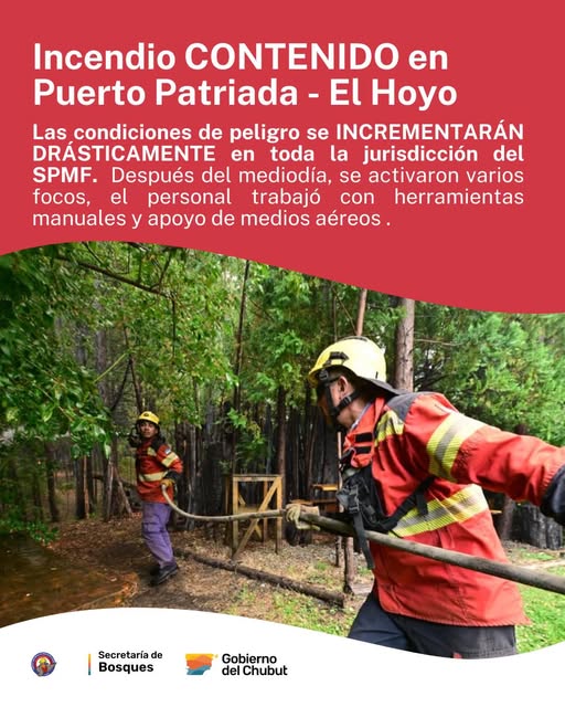Según el Servicio Provincial de Manejo del Fuego (SPMF), el incendio que afecta la zona de Puerto Patriada permanece contenido, con una superficie estimada de 14.770 hectáreas comprometidas, en áreas de matorral, bosque implantado y bosque nativo.