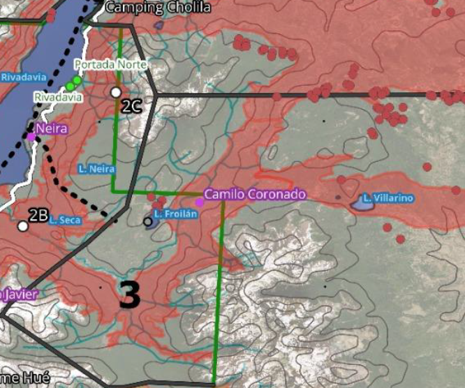 El sector 3 abarca la zona de Laguna Froilán, ubicada entre los cordones de El Riscoso y La Momia, en el límite Este del Parque Nacional Los Alerces. Este sector reviste importancia estratégica por su posición geográfica y por la posibilidad de propagación del incendio hacia áreas linderas.