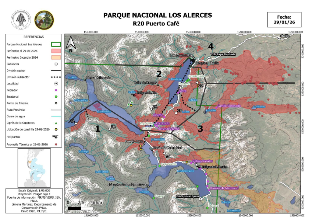En el marco del incendio forestal que afecta al Parque Nacional Los Alerces, el comando operativo definió cuatro sectores prioritarios donde se concentran las tareas de combate, con el objetivo central de afianzar líneas de defensa ya construidas y resguardar viviendas, pobladores e infraestructura.
