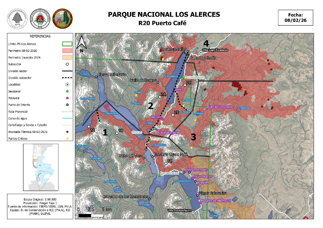 El incendio forestal permanece activo y ya afectó unas 16.000 hectáreas dentro del Parque Nacional y Reserva Nacional Los Alerces, con origen en rayos, según el parte oficial.