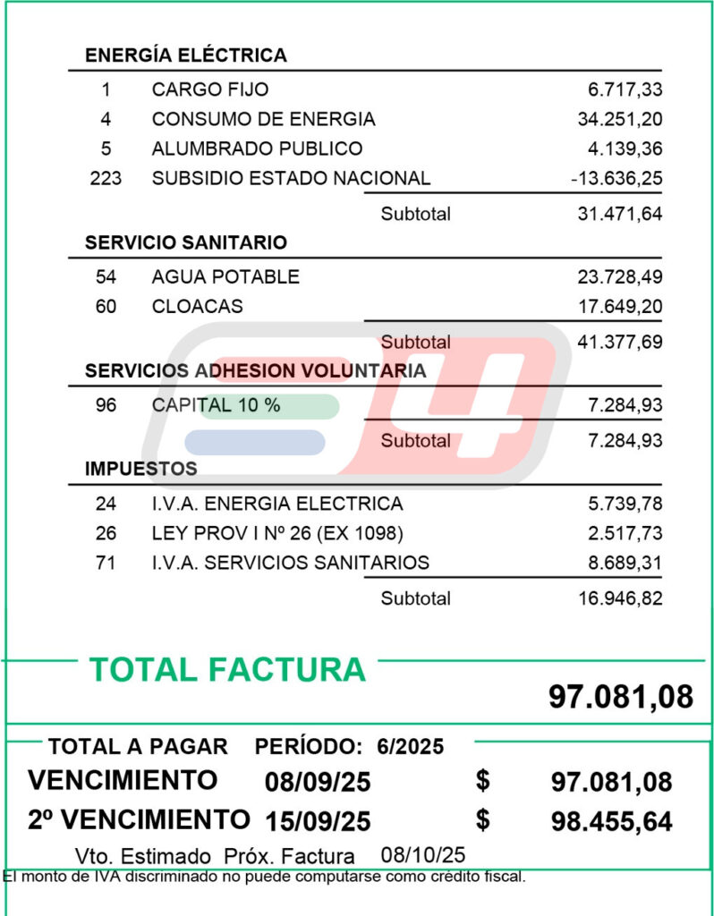 - En la parte superior, figura el detalle de los Servicios: incluye energía eléctrica, servicios sanitarios, el aporte de Adhesión Voluntaria – Capital 10%, además de los impuestos (IVA sobre energía y sanitarios, y Ley Provincial I N° 26).