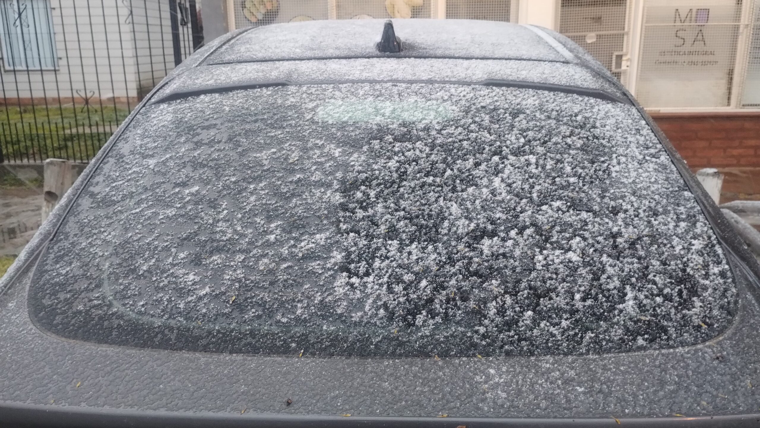 La nieve, si bien tenue por momentos y acompañada por viento del sudeste, logró acumularse levemente en superficies como techos, parabrisas y lunetas de vehículos. En cambio, en calles, plazas y plazoletas, la alta humedad impidió que se note con claridad, aunque la caída continúa y podría intensificarse.
