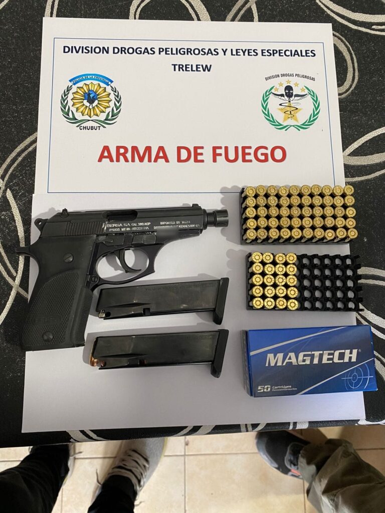 De manera simultánea, en la ciudad de Trelew, la División Drogas y Leyes Especiales realizó un allanamiento en una vivienda particular a partir de una denuncia anónima. En el lugar se secuestraron: Un pan de cocaína Un arma de fuego, Envoltorios fraccionados, Una balanza digital, Cerca de un millón de pesos en efectivo