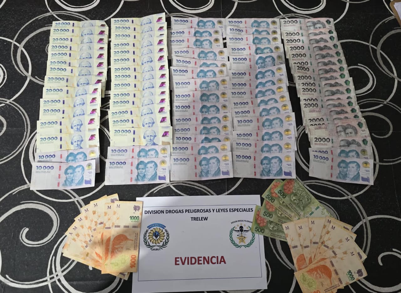 De manera simultánea, en la ciudad de Trelew, la División Drogas y Leyes Especiales realizó un allanamiento en una vivienda particular a partir de una denuncia anónima. En el lugar se secuestraron: Un pan de cocaína Un arma de fuego, Envoltorios fraccionados, Una balanza digital, Cerca de un millón de pesos en efectivo