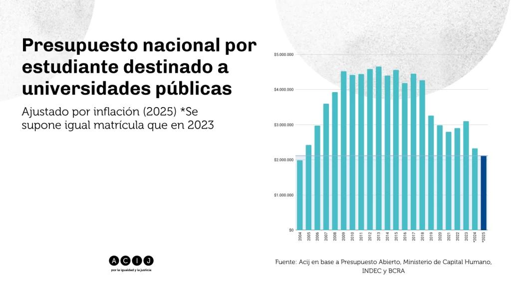 El contexto es crítico. Según la ACIJ, el presupuesto universitario actual es el más bajo desde 2006 y la inversión por estudiante es la menor desde 2005. En términos reales, los recursos cayeron 32% desde 2023, comprometiendo el funcionamiento de las casas de estudio.