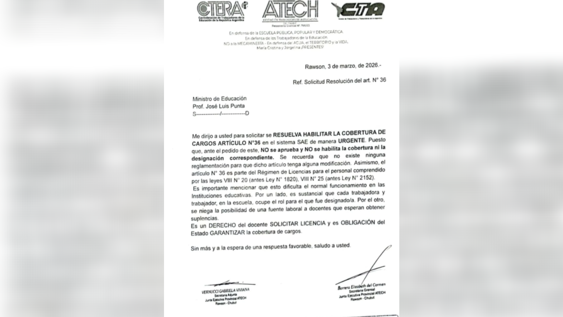 La Asociación de Trabajadores de la Educación del Chubut (ATECh) informó que realizó una presentación formal para solicitar la modificación del sistema SAE, con el objetivo de que los equipos directivos puedan gestionar suplencias cuando se otorgan licencias bajo el Artículo 36.