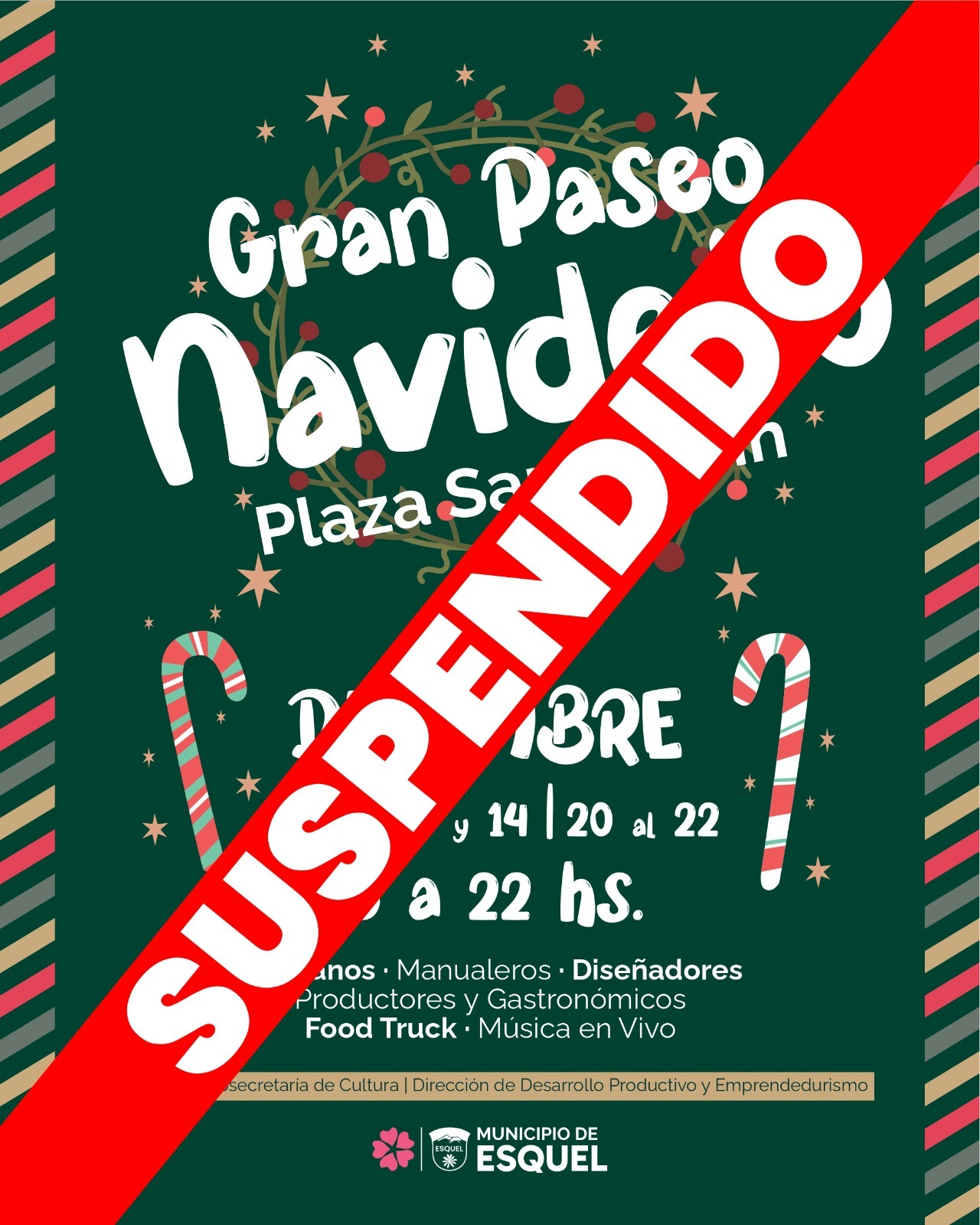 La Municipalidad de Esquel informó que el Paseo Navideño previsto para este sábado 13 y domingo 14 de diciembre en la Plaza San Martín quedó suspendido debido a la alerta amarilla por vientos y la probabilidad de lluvias emitida por el Servicio Meteorológico Nacional.