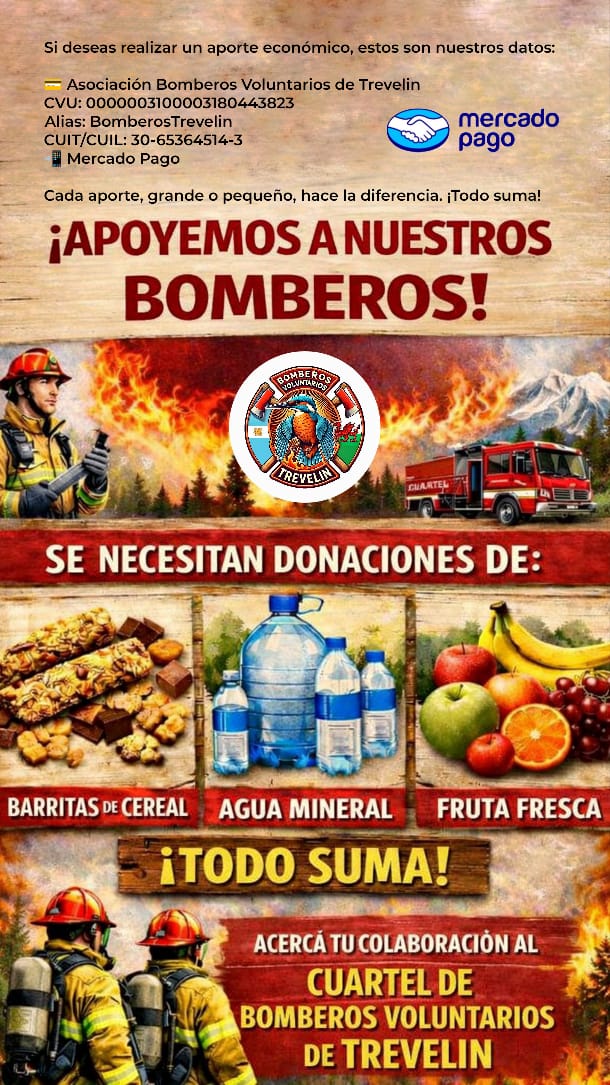 En este contexto, el Cuartel de Bomberos Voluntarios de Trevelin lanzó una campaña solidaria para acompañar el esfuerzo de quienes están en el frente del incendio.
