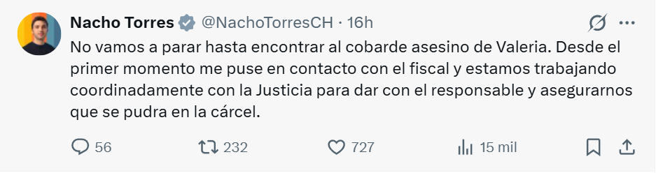A través de sus redes sociales, Torres aseguró que el Estado provincial trabaja de manera coordinada con la Justicia. “No vamos a parar hasta encontrar al cobarde asesino de Valeria y asegurarnos de que se pudra en la cárcel”, escribió el mandatario, en un mensaje que generó amplio impacto.