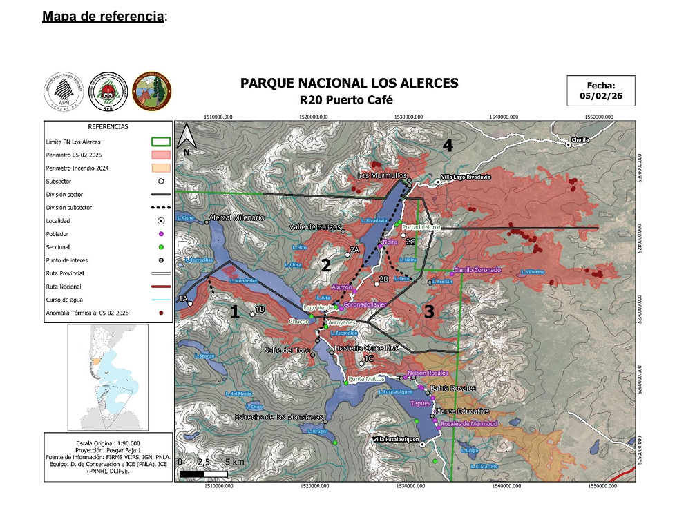 En el Parque Nacional Los Alerces, donde se registran más de 15.000 hectáreas afectadas, se desarrolla un combate sostenido, con una dinámica de adaptación permanente a las condiciones meteorológicas y priorizando la seguridad del personal.