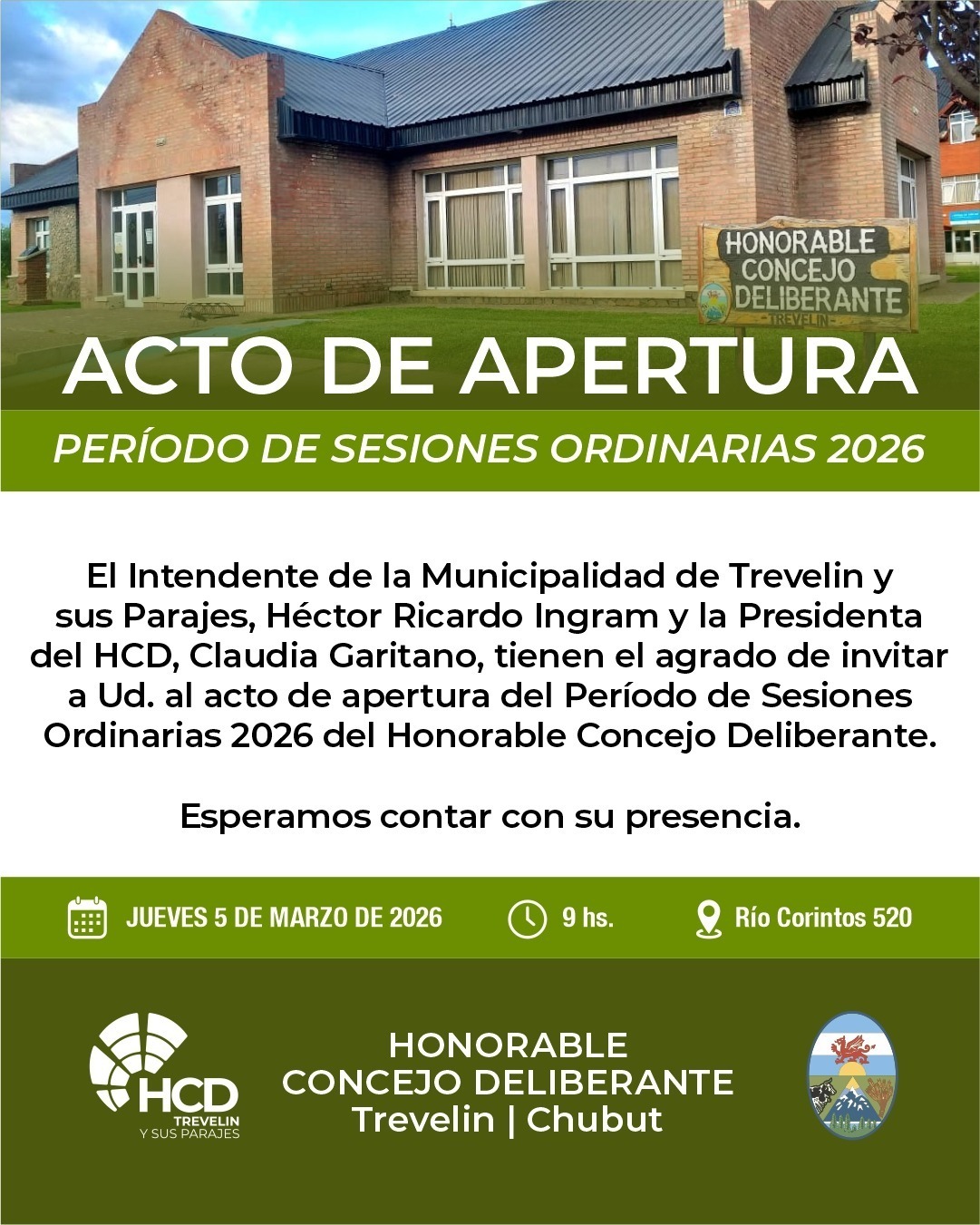 El acto de apertura se realizará el jueves 5 de marzo de 2026 a las 9 horas, en la sede del Concejo Deliberante ubicada en Río Corintos 520, en Trevelin.