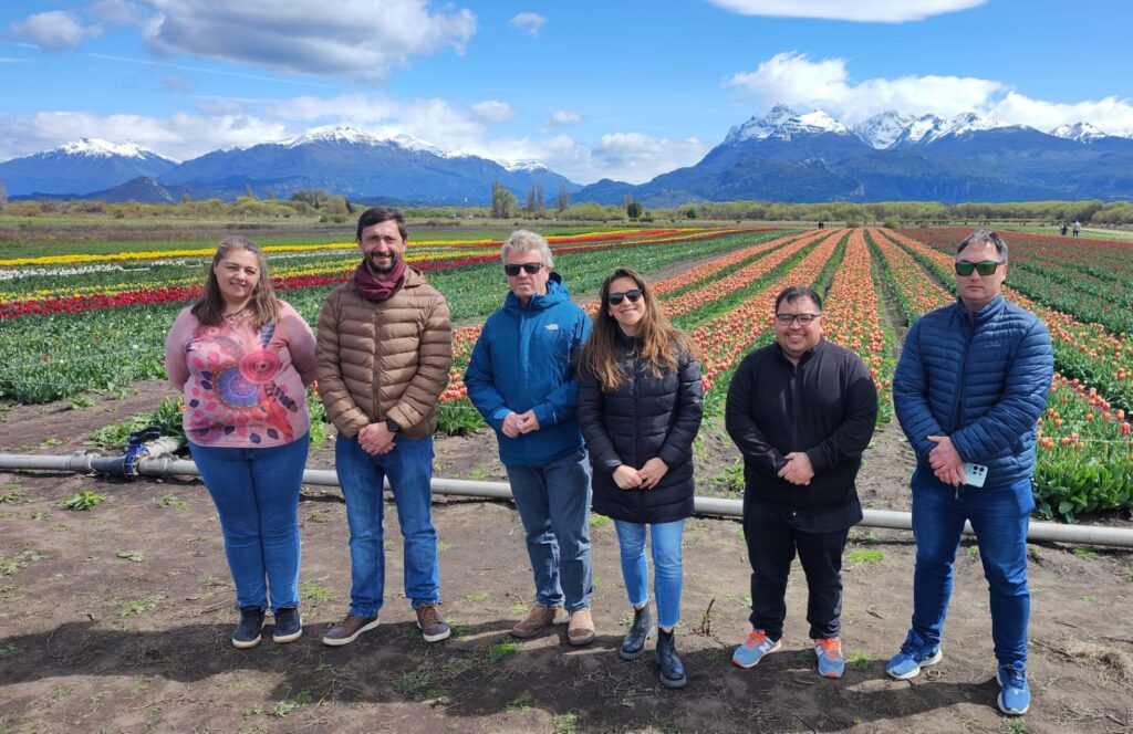 El intendente de Trevelin, Héctor Ingram, junto a la secretaria de Turismo, Cintia Figueroa, la presidenta del Concejo Deliberante, Claudia Garitano, el concejal David Arakawa y funcionarios del Ejecutivo y Legislativo, visitaron el Campo de Tulipanes del emprendedor Juan Carlos Ledesma.