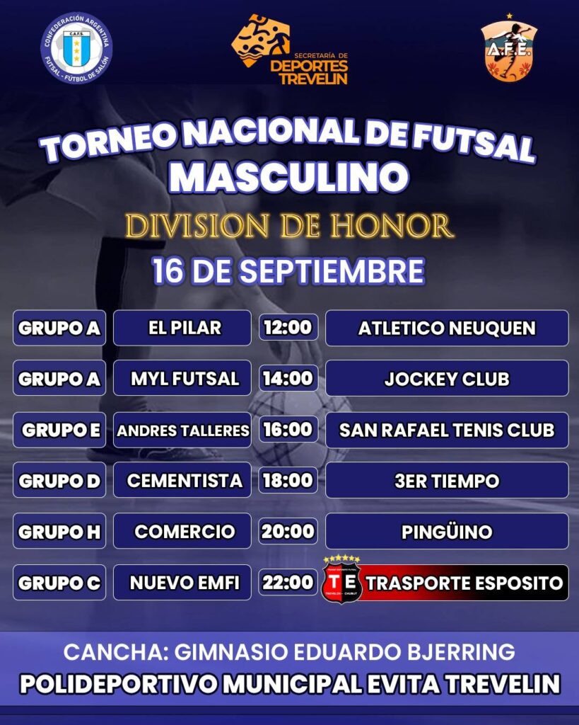 La Secretaría de Deportes y Recreación de Trevelin confirmó que durante tres jornadas la ciudad será epicentro de un espectáculo deportivo de primer nivel. Más de 20 equipos provenientes de distintas provincias llegan para disputar la División de Honor del futsal masculino, uno de los torneos más importantes de la disciplina.