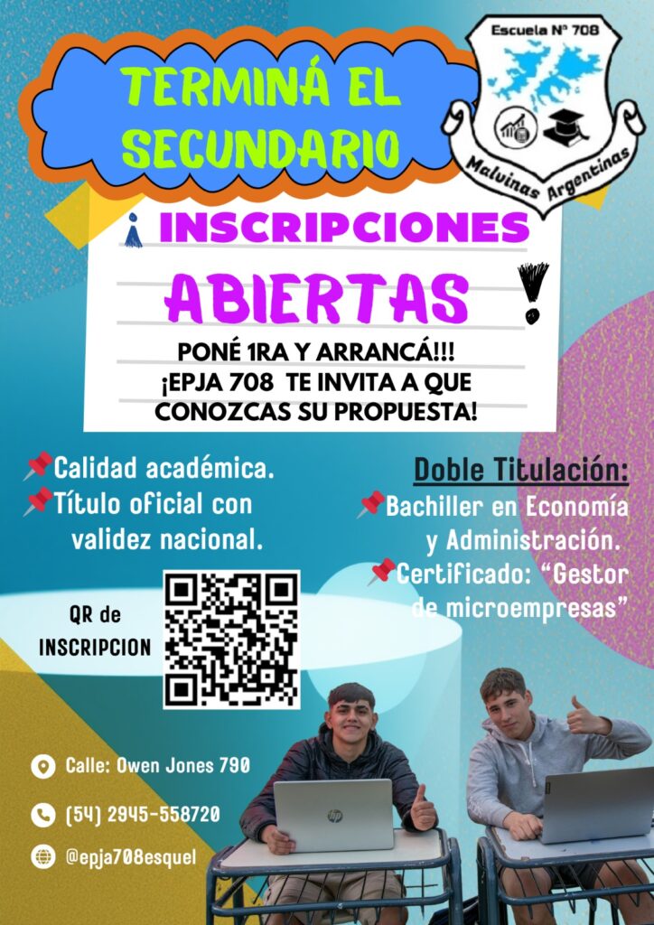 Las inscripciones continúan abiertas. Los interesados pueden acercarse desde las 19 horas al edificio de la escuela con fotocopia de DNI y certificado de estudios previos. También pueden consultar a través de Instagram en Epja 708 Esquel.