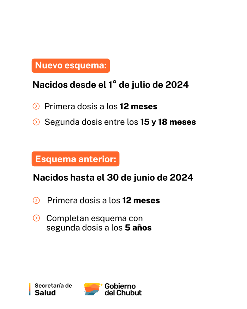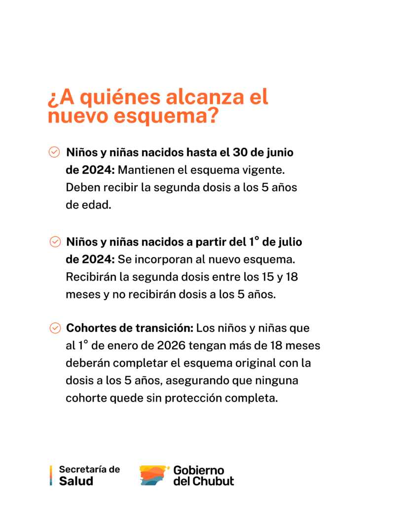Mantienen el esquema vigente hasta diciembre de 2025. Deben recibir la segunda dosis a los 5 años de edad. - Nacidos a partir del 1º de julio de 2024: